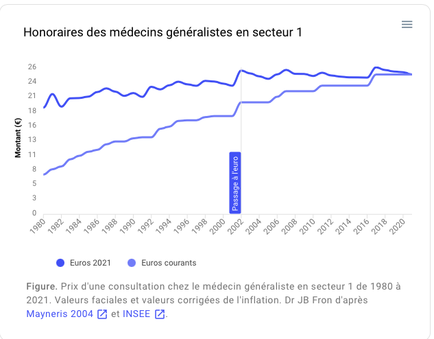 Publication préliminaire afin de disposer d’une série longue sur les prix des consultations de médecin généraliste de 1980 à 2021, n’ayant pas trouvé d’article complet sur le sujet.