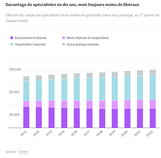 La Direction de la recherche, des études, de l’évaluation et des statistiques a publié une étude en mars 2021 sur la démographie médicale d’ici à 2050. Elle confirme une raréfaction de la pratique libérale depuis 2012, au profit d’un exercice mixte ou exclusivement salarié. En prenant l’hypothèse que ces comportements se poursuivent et à politiques législatives constantes (nombre de médecins formés par an et arrivée de médecins étrangers), le modèle prévoit une stagnation des effectifs jusqu’en 2030, avant une hausse assez importante jusqu’en 2050 : « Cette hausse se traduirait en partie par l’augmentation de l’exercice salarié, qui est le mode d’exercice à l’installation le plus souvent choisi par les médecins nouvellement diplômés. »