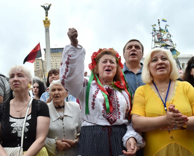 Des personnes participent à un rassemblement de masse sur la place de l’Indépendance à Kyiv le 1er juin 2014. © Photo Sergei Supinsky/AFP