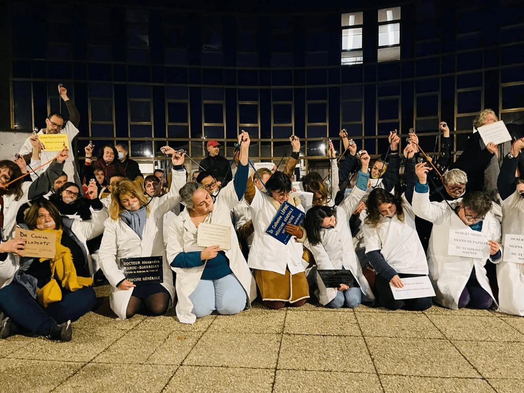On s’est réunis hier soir, en blouse, le stétho autour du cou en situation d’étranglement avec notre plaque professionnelle dans les mains et du sparadrap sur la bouche pour simuler la mort de notre métier.