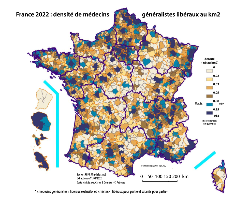 Densité de médecins généralistes libéraux au km² en France en 2022. – Association des maires ruraux de France