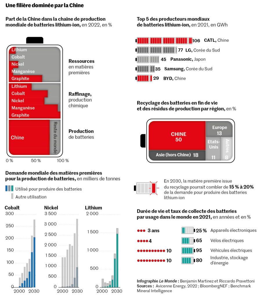 De nombreux secteurs vont en bénéficier : les mobilités autres que l’automobile (scooters, vélos, trottinettes, skateboards…) et l’électronique (téléphones, ordinateurs, tablettes, objets connectés tels que les compteurs intelligents ou les satellites), mais également les appareils domestiques sans fil comme les brosses à dents, les aspirateurs, les télécommandes, les alarmes ou l’outillage portable de bricolage et de jardinage (perceuses, tondeuses, tronçonneuses…). Les transports sont aussi concernés (trains, métros et avions) ainsi que l’industrie et ses engins de levage ou de chantier. Idem pour toutes les activités nécessitant des batteries de secours en cas de coupure de courant sur le réseau (hôpitaux, data centers). Et tous les dispositifs stationnaires liés aux sources d’énergies renouvelables qui doivent stocker de l’électricité (parcs éoliens, fermes photovoltaïques, nouveaux lampadaires d’éclairage public fonctionnant avec des panneaux solaires, maisons équipées de panneaux solaires…).Lire aussi l’entretien : Article réservé à nos abonnés Batteries : « L’Europe est dépendante de la Chine non seulement pour les matières premières, mais aussi pour les produits semi-finis »