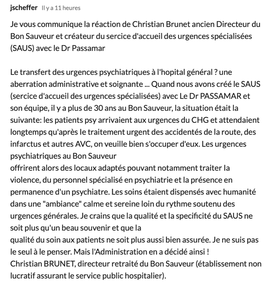 C’est tout simplement une catastrophe pour le Bon Sauveur (Hôpital psychiatrique de la fondation Pierre Jammet à but non lucratif) , pour l’hôpital général, pour les patients psychiatriques, pour le personnel soignant de l’hôpital général, pour les patients des urgences.