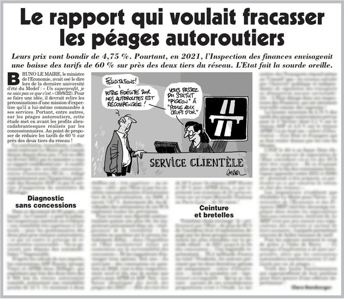 Bruno Le Maire, a étouffé un rapport de l’Inspection des Finances qui décortiquait les superprofits des concessionnaires d’autoroutes et proposait de baisser les péages de… 60 % sur les deux tiers du réseau #péagesautoroutes #BrunoLeMaire http://lecanardenchaine.fr