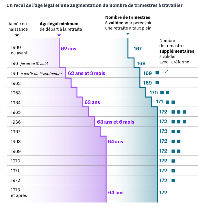Après la réforme. Emmanuel ne pourra plus partir à 62 ans. Il pourra toujours prendre sa retraite à 63 ans et 3 mois, mais le montant de sa pension sera plus faible qu’avant la réforme, puisque la durée de cotisation requise pour les personnes de sa génération passe à 172 trimestres (+ 3). S’il souhaite partir à taux plein, il devra donc attendre neuf mois supplémentaires – soit jusqu’au début de l’année 2029, à 64 ans. Avant la réforme, ces mois de travail supplémentaires auraient été facultatifs (au-delà de l’âge légal de départ et de la durée d’assurance requise), et lui auraient permis de bénéficier d’une surcote de 3,75 % de sa pension de base (à raison de 1,25 % par trimestre).
