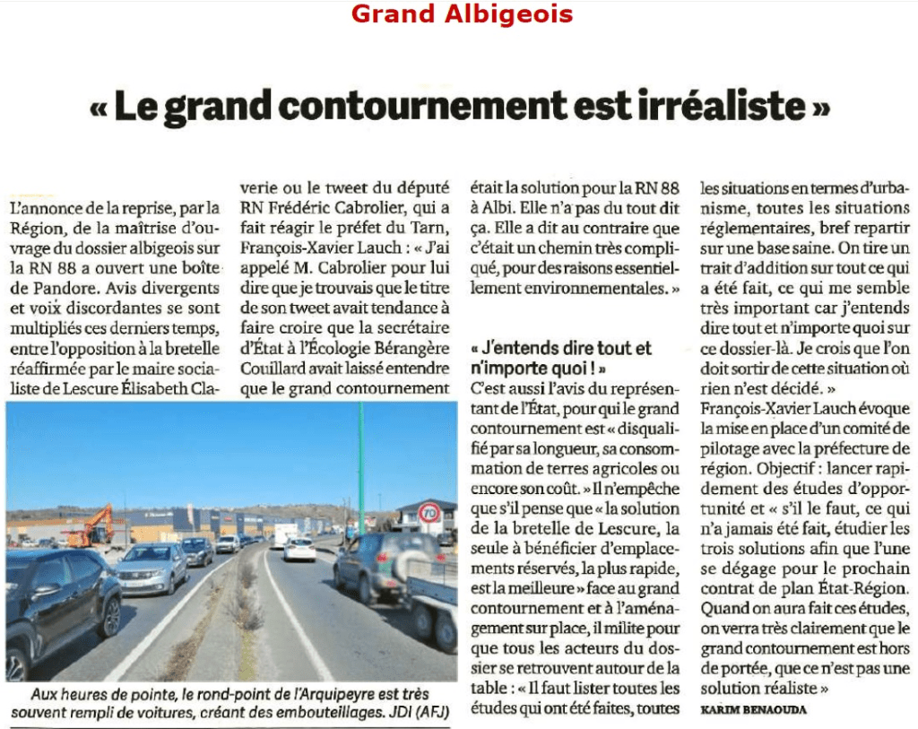 Je constate simplement que les décisions ne sont toujours pas prises. Je m’associe aux nombreux Lescuriens, et notamment ceux du quartier de Najac, qui subissent le matin, le soir et maintenant la journée, les embouteillages pour se rendre sur le lieu de travail ou rentrer chez eux. Mais je suis satisfait du volontarisme affiché par Carole Delga, présidente de la Région Occitanie et future propriétaire de la RN88, ainsi que celui de Monsieur le Préfet, d’avancer sur le sujet. J’attends de voir. Néanmoins, je pense ne pas être le seul Lescurien, à partager également leur vision pragmatique. Le grand contournement n’est plus la solution.