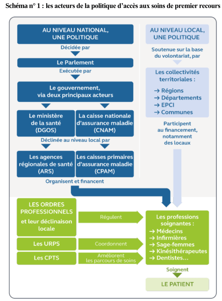 La définition des règles d’accès à ces soignants et les modalités d’exercice de leur profession dépendent de l’État, responsable de la politique sanitaire, déclinée en région par les agences régionales de santé (ARS). Les régimes d’assurance maladie, en particulier la Caisse nationale d’assurance maladie, au niveau national, et les caisses primaires d’assurance maladie (Cpam), dans les départements, prolongent et mettent en œuvre les orientations nationales par des conventions qui précisent les actes remboursés et les conditions d’exercice des professionnels concernés317. La politique destinée à améliorer l’accès aux soins, en particulier de premier recours, est donc principalement portée par l’État et ses opérateurs, au niveau national et déconcentré.