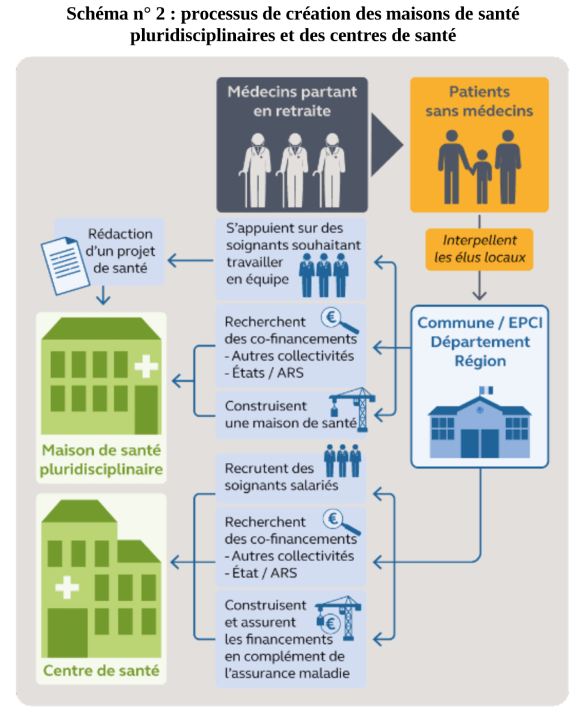La Cour des comptes relève que le recours au salariat, grâce à des centres de santé, peut être une solution là où la densité en médecins libéraux est très dégradée. La Cour précise ainsi que la création du centre de santé de Saône-et-Loire est pertinente. En outre, depuis la loi 3 DS relative à la différenciation, la décentralisation et la déconcentration, la gestion d’un centre de santé par un département est explicitement prévue par la loi.