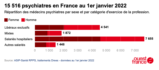 Selon les données de la Drees (Direction de la recherche, des études, de l’évaluation et des statistiques), la France comptait au 1er janvier 2022 un peu plus de 15 500 médecins psychiatres, dont près de la moitié sont des salariés hospitaliers, et un tiers sont des libéraux exclusifs.