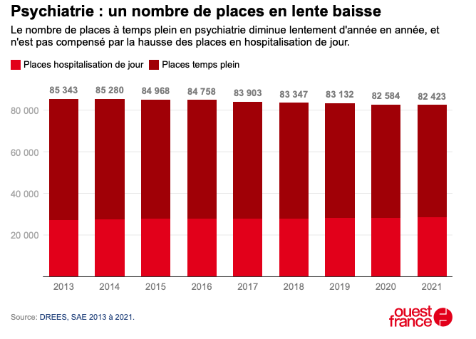La psychiatrie en France pouvait compter en 2021 sur un peu plus de 53 000 lits d’hospitalisation complète, et un peu moins de 29 000 places en hospitalisation partielle (journées ou nuitées de moins de 24 heures).