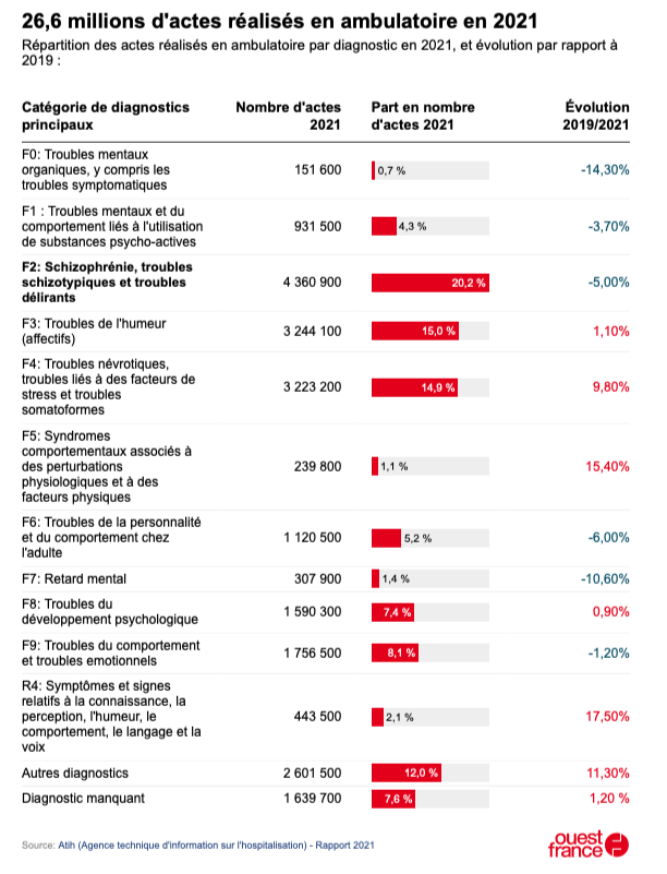 Les actes associés à la schizophrénie, troubles schizotypiques et troubles délirants diminuent de 5 % en 2021 par rapport à 2019. Par contre, les troubles névrotiques, troubles liés à des facteurs de stress et troubles somatoformes progressent de 9,8 %.
