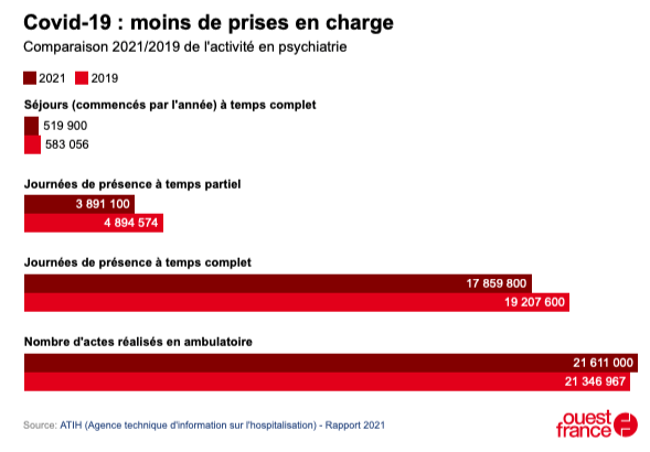La pandémie de Covid-19 a réduit de manière sensible le nombre de séjours en psychiatrie. En 2021, selon un rapport de l’Agence technique de l’information sur les hospitalisations (Atih), 398 300 patients ont été pris en charge à temps partiel ou temps complet en psychiatrie. C’est 22 000 de moins qu’en 2019.
