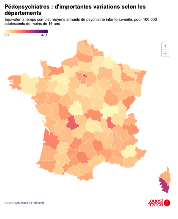 Avec 47,1 ETP pour 100 000 adolescents, le plus fort taux est enregistré à Paris. La Corse-du-Sud, la Haute-Vienne et le Val-de-Marne viennent ensuite, avec plus de 20 praticiens pour 100 000 enfants et adolescents.