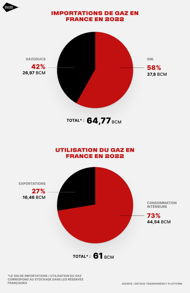Les données compilées par Greenpeace, puis recoupées par Disclose, montrent en effet que la France a largement de quoi satisfaire ses besoins en gaz sans avoir à installer de nouvelles infrastructures. Pour preuve : sur les 64,8 milliards de mètres cubes (bcm) de gaz importés en 2022, 25 % (16,47 bcm) ont été revendus à ses voisins européens, selon les chiffres du réseau européen des gestionnaires de réseau de transport de gaz (ENTSOG).