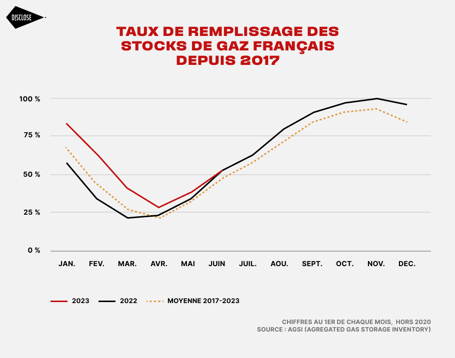 Pour adopter une vision complète de la situation du gaz en France, il faut ajouter les réserves constituées ces dernières années. Les chiffres fournis par le lobby européen du secteur, Gas Infrastructure Europe, confirment la situation extrêmement favorable des stocks français, remplis à 52,2 % à la fin mai 2023, un niveau identique à celui observé un an plus tôt (52 %) et bien supérieur à la fin mai 2020 (40 %).