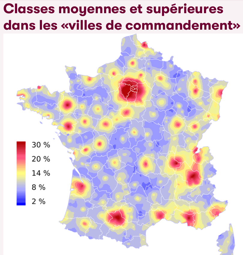 Les classes moyennes et supérieures ont investi les métropoles et les grandes villes au point de constituer plus de la moitié de la population active dans certains cas et plus encore dans certains quartiers. Les cadres dominent au cœur des grandes agglomérations, les métropoles ou leurs suivantes immédiates qui possèdent des institutions universitaires et administratives de premier plan. Pour cette raison, on les qualifiait de «villes de commandement» dans les années 1960. Toutes les capitales des 21 anciennes régions figurent dans le groupe de tête auquel seules s’ajoutent Grenoble, Nice, Angers, Tours et des villes de l’Est. Alors que la proportion de cadres y dépasse souvent 20%, elle chute à moins de 2% dans de nombreuses zones rurales.