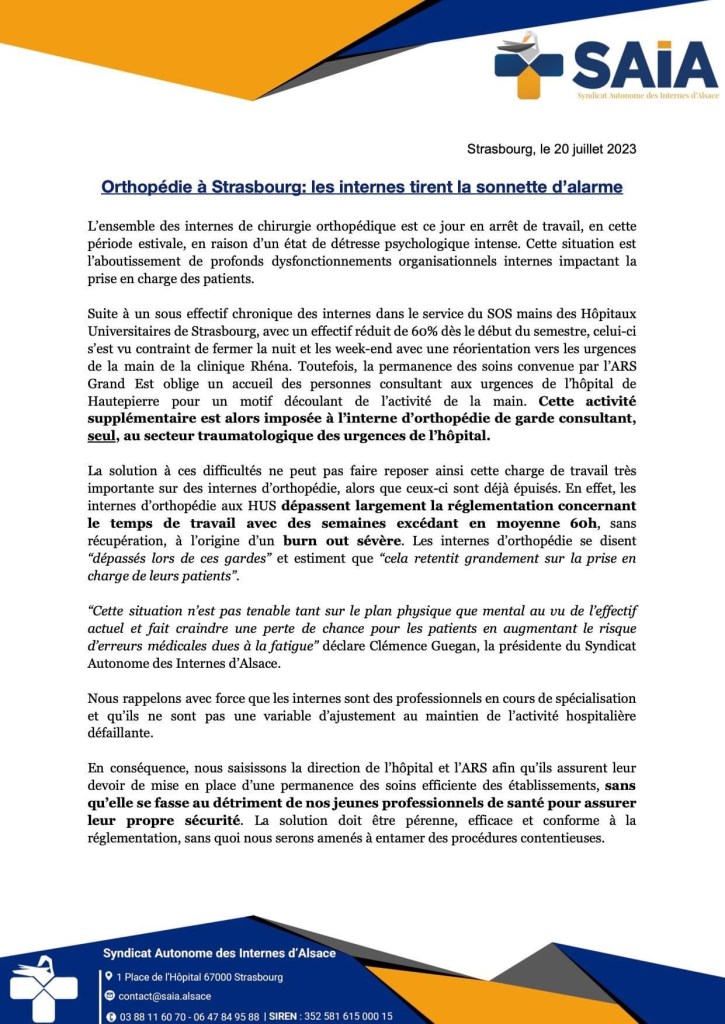 Si les internes sont épuisés, c’est notamment à cause des effectifs particulièrement critiques, en particulier dans le service SOS Main. Depuis le 2 mai dernier, seuls quatre puis trois internes étaient présents alors que dix sont nécessaires. Le Saia a rédigé un communiqué, diffusé jeudi 20 juillet, dans lequel il alerte sur ce “sous-effectif chronique des internes (…), avec un effectif réduit de 60% dès le début du semestre”. Le service a été contraint de fermer ses portes la nuit et les week-end, mais la permanence des soins convenue avec l’ARS Grand Est “oblige un accueil des personnes consultant aux urgences de l’hôpital de Hautepierre pour un motif découlant de l’activité de la main”, indique le communiqué. Il mentionne aussi que cette activité supplémentaire est alors “imposée à l’interne d’orthopédie de garde consultant seul au secteur traumatologique des urgences de l’hôpital”. Pour la présidente du Saia, ces gardes ne doivent pas nécessairement être effectuées par des internes. “Quand une personne vient aux urgences avec une entorse simple, un avis de l’interne orthopédique de garde n’est pas forcément nécessaire…”, fait-elle valoir. Le syndicat a recueilli le témoignage d’internes s’estimant “dépassés lors de ces gardes”.