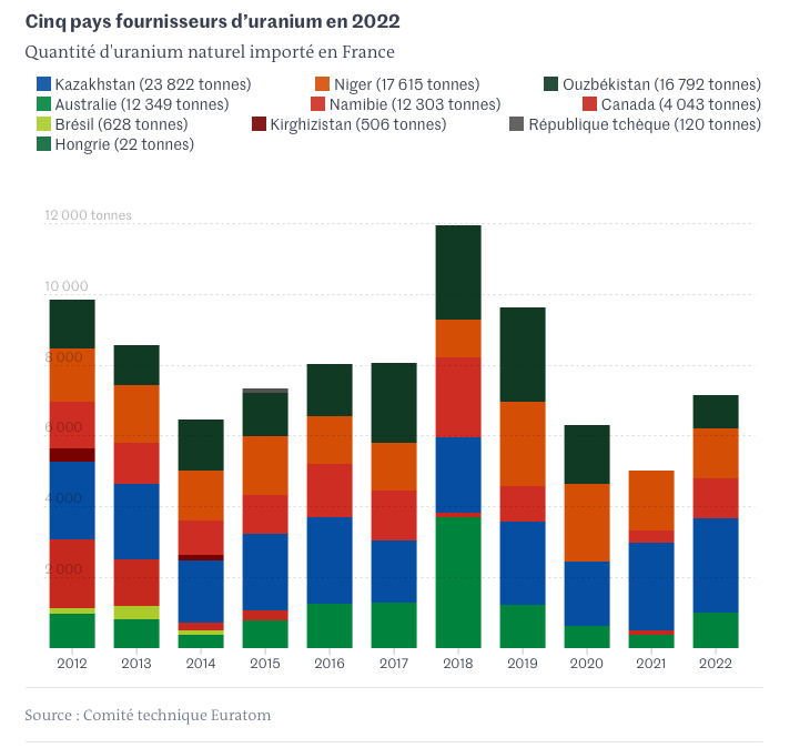 Sur les dix dernières années, les 88 200 tonnes d’uranium naturel importées vers la France provenaient essentiellement de trois pays : le Kazakhstan (27 %), le Niger (20 %) et l’Ouzbékistan (19 %). Le Niger étant une place importante, mais surestimée par certains responsables politiques, dans l’approvisionnement de la France.