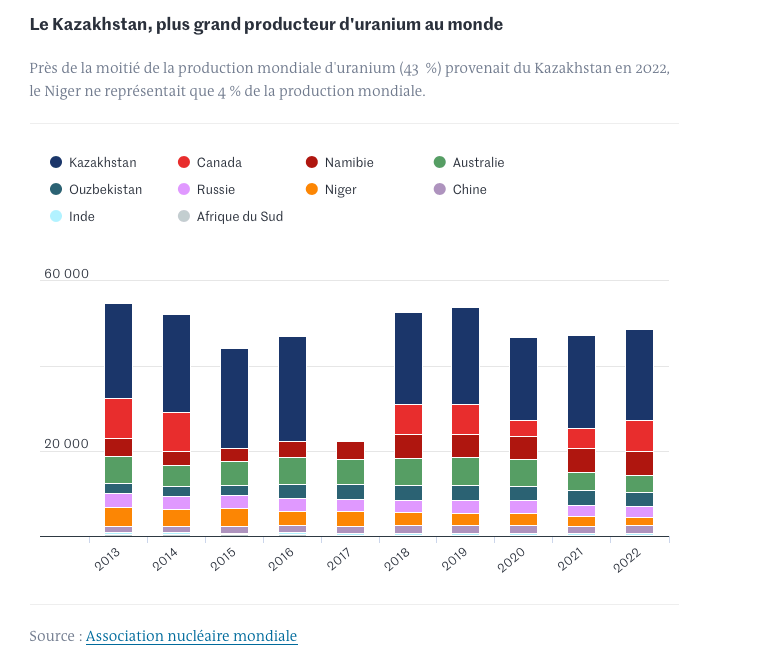 Près de la moitié de la production mondiale d’uranium (43 %) provenait du Kazakhstan en 2022, le Niger ne représentait que 4 % de la production mondiale.
