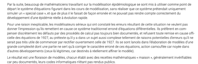 Par la suite, beaucoup de mathématiciens travaillant sur la modélisation épidémiologique se sont mis à utiliser comme point de départ le système d’équations figurant dans les cours de modélisation, sans réaliser que ce système prétendait uniquement simuler un « special case », et que de plus il le faisait de façon erronée et ne pouvait pas rendre compte correctement du développement d’une épidémie réelle à évolution rapide.