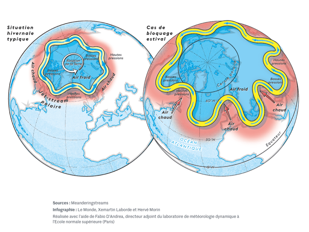 En hiver, le fort gradient de température entre l’équateur et le pôle Nord assure la force du courant-jet polaire. En été, le plus faible contraste de température l’affaiblit, et il circule plus au sud. Les anomalies chaudes qui peuvent apparaître dans ses méandres, à l’interface entre l’air polaire froid et les masses d’air chaud venues du sud, sont alors plus fortes en termes de température absolue. Le jet peut former une couronne circumpolaire dont les ondulations restent stationnaires, entraînant des blocages météorologiques (canicule, sécheresse) pouvant affecter simultanément plusieurs régions.