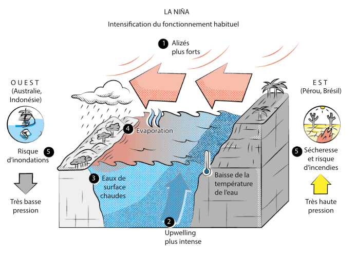 A l’inverse, pendant La Niña, les alizés se renforcent, entraînant une accumulation d’eau chaude dans l’ouest du Pacifique et une remontée d’eau froide dans l’est, toutes deux plus importantes. Le gradient thermique entre les deux rives s’accentue, et des températures plus basses que la normale apparaissent dans le Pacifique centre et est.