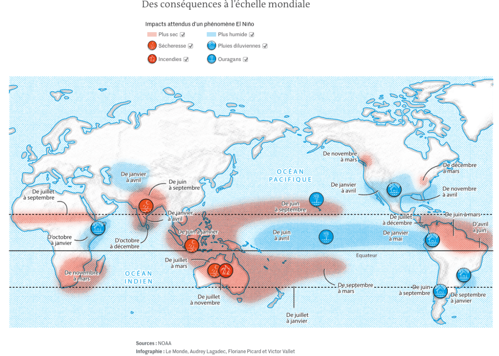 Chacun de ces « enfants » étant unique, les conséquences que ceux-ci entraînent s’avèrent très différentes, souvent négatives mais parfois aussi positives. De manière générale, lors d’El Niño, le déplacement des masses d’eau chaudes vers l’est du Pacifique provoque des sécheresses et des risques accrus d’incendie en Australie, en Indonésie, en Inde et plus largement dans le sud-est de l’Asie, où les précipitations de la mousson diminuent. « La récolte de riz peut être réduite de moitié en Indonésie », prévient Eric Guilyardi. A l’inverse, le phénomène peut entraîner davantage de pluies diluviennes, et donc des inondations, dans certaines régions de l’Amérique du Sud, de la Corne de l’Afrique et de l’Asie centrale.