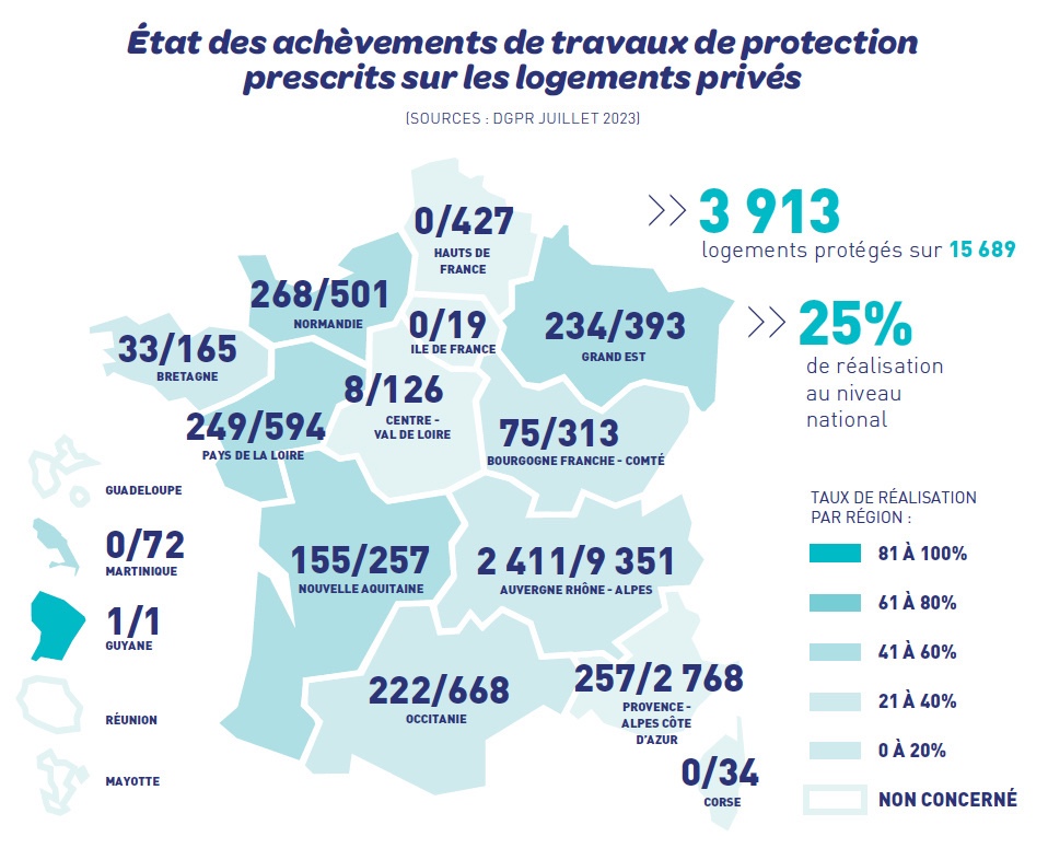 Mais les critiques les plus vives du réseau de collectivités locales sont dirigées contre trois groupes de mesures qu’elles considèrent comme des échecs patents. C’est en premier lieu la réalisation des travaux dans les logements. Seulement 25 % des travaux de protection prescrits (vitrages résistants aux explosions, pièces de confinement, etc.) dans 15 689 logements privés ont été effectués.