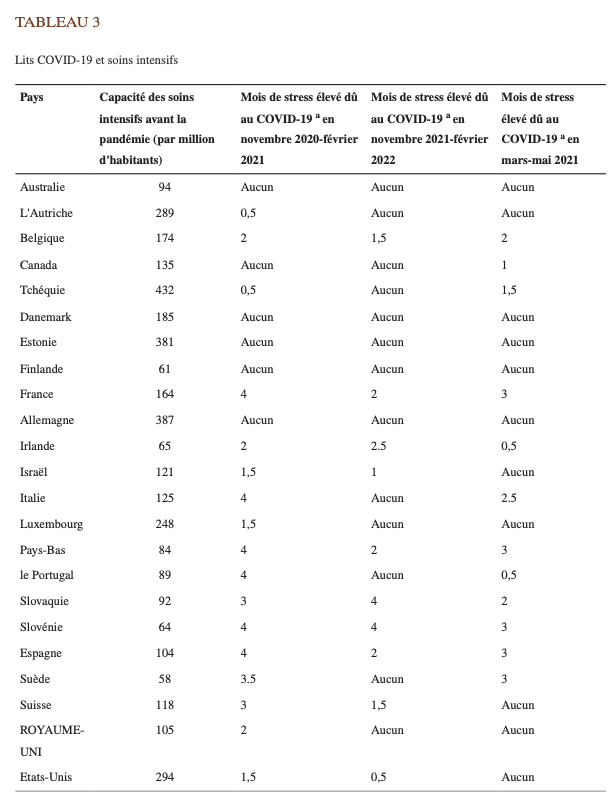 Dans 23 pays disposant de données (tableau 3), 44 , 45 , 46 La COVID‐19 a occupé plus de 25 % de la capacité en lits des soins intensifs prépandémiques pendant une moyenne de 2 mois de novembre 2020 à février 2021. La période moyenne d’occupation aussi élevée par la COVID‐19 était inférieure à la moitié au cours de la période respective de novembre 2021 à février 2022, même si tous ces pays ont connu un pic élevé (puis un recul) des ondes Omicrons au cours de cette période : 4 à 39 % de leur po‐ pulation avaient documenté une infection au cours de ces 4 mois (le nombre total d’infections peut être le double) ou plus). La plupart des pays (13 sur 23) n’ont connu aucune période entre novembre 2021 et février 2022 où l’occupation des lits liés au COVID‐19 représentait plus de 25 % de la capacité de leurs unités de soins intensifs avant la pandémie. Étant donné que de nombreux pays ont également augmen‐ té leur capacité en soins intensifs pendant la pandémie, la période pendant laquelle le stress a été élevé a probablement été encore plus courte. Dans les 10 pays où le taux d’occupation des lits liés au CO‐ VID‐19 dépassait 25 % de leur capacité d’accueil avant la pandémie, les pics ont été plus faibles au cours de la saison 2021-2022 qu’en 2020-2021.