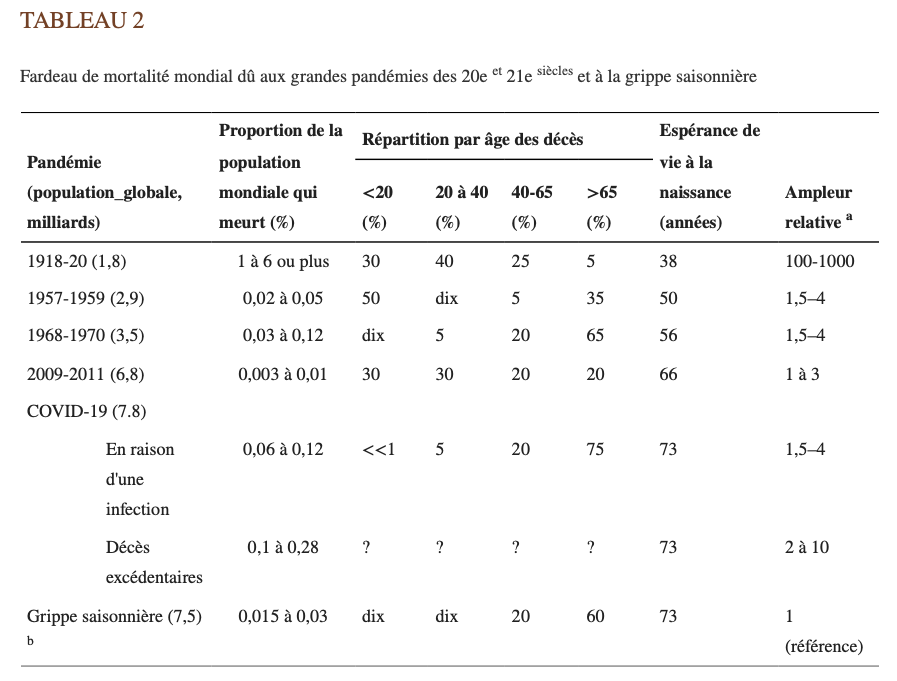 Il est important de comprendre à quel point cette pandémie nous a éloignés de la « normale », pour comprendre ce que signifierait un « retour à la normale ». « Normal » est déjà un concept insaisissable, car des fluctuations substantielles existent d’une année à l’autre et une grande variabilité (largement in‐ expliquée) existe chaque année dans différents pays et lieux. On peut comparer les récentes saisons ty‐ piques de grippe aux charges de mortalité respectives des pandémies passées des 20e et 21e siècles (Ta‐ bleau 2). Pour une comparaison équitable, il convient de tenir compte de la taille de la population mon‐ diale. De plus, il faut tenir compte de la répartition par âge des décès dus à une infection et de l’espé‐ rance de vie à ce moment-là pour estimer les années-personnes perdues parmi les personnes décédées. Enfin, on peut exprimer l’ampleur de la pandémie en proportion du nombre total d’années-personnes de vie attendues pour la population à cette époque qui ont été perdues à cause des décès dus à l’infec‐ tion. Par exemple, si une population a une espérance de vie cumulée de 100 000 années-personnes et que les décès dus à des infections génèrent 1 000 années-personnes perdues, la proportion perdue est de 1 %. En outre, l’ajustement de la qualité de vie en fonction des années-personnes perdues est utile, mais nécessite des données méticuleuses.
