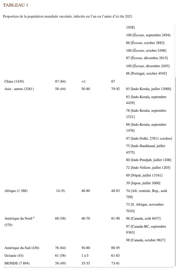Les enquêtes de séroprévalence réalisées fin 2021 concordent avec ces estimations de l’immunité de la population (Tableau 1). 7 Il est vrai que les enquêtes peuvent être biaisées et seuls quelques pays dis‐ posent de données récentes. Cependant, presque tous les tableaux 1les données montrent des estima‐ tions de séroprévalence >70 % au second semestre 2021. Avec la poursuite des vaccinations et des in‐ fections, les estimations ont probablement encore augmenté depuis lors. Fin février 2022, 63 % de la population mondiale avait reçu un vaccin (55 % étaient « entièrement » vaccinés), presque autant de personnes avaient probablement été infectées au moins une fois et probablement près de 90 % de la po‐ pulation mondiale était vaccinée ou infectée à moins une fois.