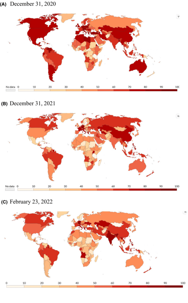 Indice de rigueur d’Oxford pour la réponse gouvernementale au COVID‐19. (A) 31 décembre 2020, (B) 31 décembre 2021, (C) 23 février 2022