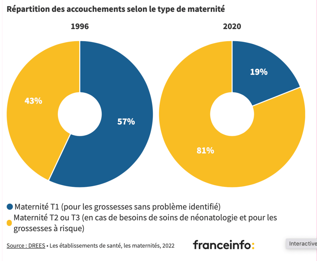 Ce phénomène est plutôt lié aux politiques de santé mises en place depuis les années 1970. Les pouvoirs publics veulent concentrer les accouchements vers les maternités les mieux équipées, pour des raisons de sécurité, disent-ils, au détriment des moins équipées. C’est d’ailleurs pour cela qu’en 1998, les décrets Périnatalité organisent les maternités en quatre catégories, pour mieux faire correspondre « le niveau de risque pour la patiente et le nouveau-né et le type de la maternité d’accueil », explique la Direction de la recherche, des études, de l’évaluation et des statistiques (Drees).