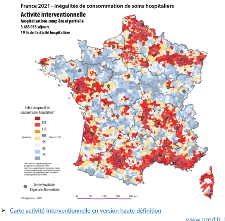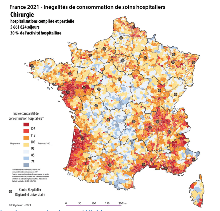 L’étude révèle, des écarts de consommation de soins hospitaliers qui se creusent et s’amplifient entre les espaces urbains denses et le milieu rural très peu dense, marquant le signe d’une prise en charge trop tardive. Les écarts sont particulièrement importants en ce qui concerne la chirurgie et les activités interventionnelles, qui représentent à elles deux 50 % de l’activité hospitalière.