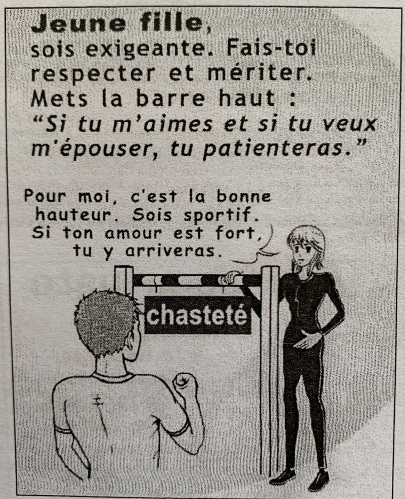 Cette idée est martelée jusque dans des livrets remis aux élèves de seconde. L’un d’entre eux, consulté par Mediapart, cite l’abbé Grosjean qui explique combien il est important d’éviter les couples lors de l’adolescence et de respecter la règle du « no flirt ». « Mes amis, je compte sur vous pour rendre à nouveau la chasteté tendance », conclut-il.