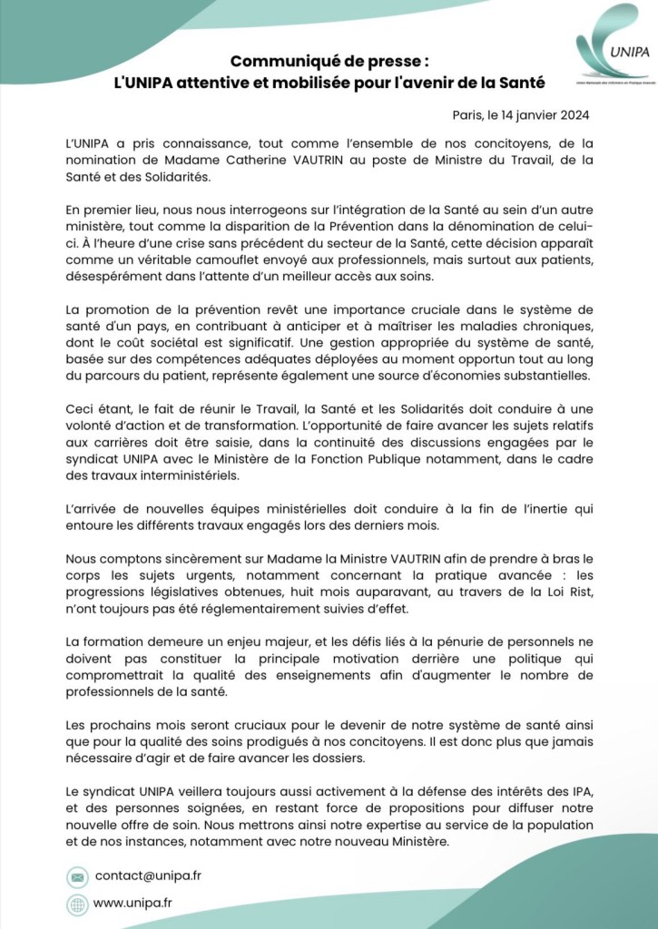 Le Bureau de l’Union Nationale des Professionnels de Santé (UNPS) salue la nomination de Madame Christine Vautrin en tant que Ministre du Travail, de la Santé et des Solidarités.