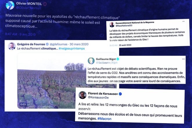 Captures d’écran de posts climatosceptiques d’élus et candidats RN sur X. © Photomontage Mediapart