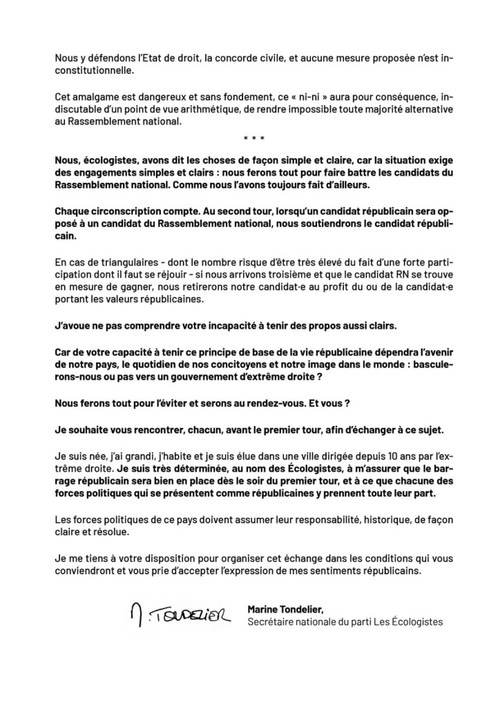 Nous mesurons combien ce choix est difficile compte tenu de l’importance des divergences qui ont opposé les uns et les autres au cours des dernières années et des fortes tensions ayant existé au sein de la société française. Mais, dans les circonstances présentes, il est indispensable de surmonter ces rancœurs et de faire preuve de responsabilité pour préserver la démocratie et la République.