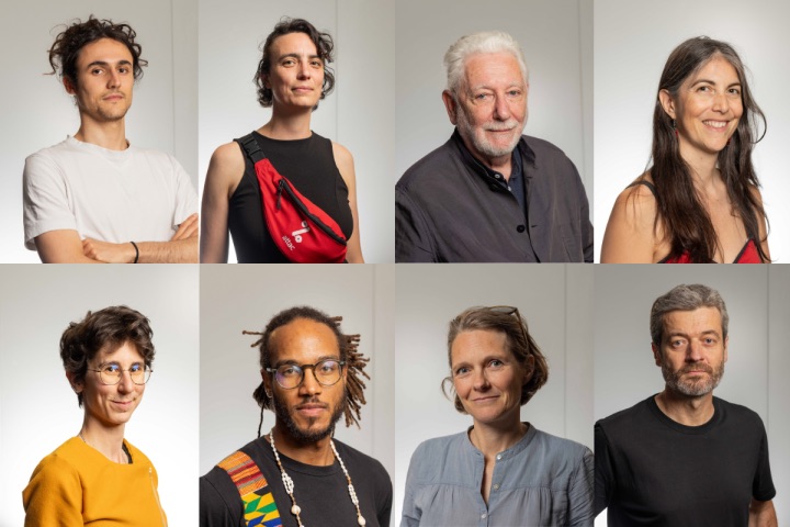En haut, de g. à d. : Amine Messal, Lou Chesné, Philippe Descola et Juliette Renaud. En bas, de g. à d. : Marion Rivet, Malcom Ferdinand, Claire Nouvian et Jean-François Julliard. – © Mathieu Génon / Montage Reporterre
