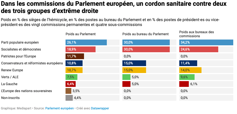 Il reste à voir si ce cordon sanitaire tiendra au fil des mois. Au-delà de la désignation des postes clés dans les commissions, il porte aussi sur l’attribution de rapports et de projets de directive aux député·es d’extrême droite jugé·es infréquentables. À ce jeu-là, il pourrait être plus difficile, sur le long terme, de bloquer les demandes des eurodéputé·es du troisième plus grand groupe du Parlement européen.