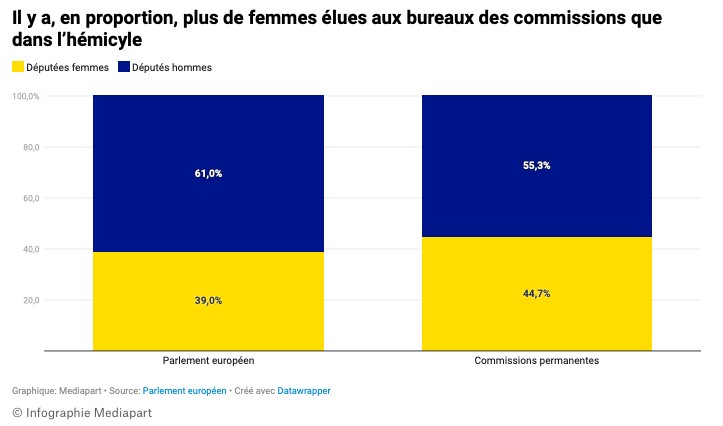 Sur le front de la parité, le Parlement européen sorti des urnes en juin compte 39 % de femmes. D’après notre décompte, cette proportion grimpe à 44,7 % si l’on ne retient que les 114 présidences et vice-présidences distribuées mardi.