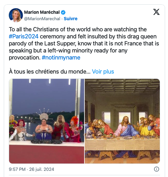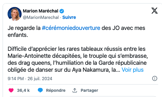 Plus sévère, l’ancienne proche d’Éric Zemmour et ex-membre de Reconquête! Marion Maréchal sur X a tancé : «Difficile d’apprécier les rares tableaux réussis entre les Marie-Antoinette décapitées, le trouple qui s’embrasse, des drag-queens, l’humiliation de la Garde républicaine obligée de danser sur du Aya Nakamura, la laideur générale des costumes et des chorégraphies. On cherche désespérément la célébration des valeurs du sport et de la beauté de la France au milieu d’une propagande woke aussi grossière». En réponse à cette critique, la députée insoumise Ersilia Soudais a commenté : «Ah, l’extrême-droite, toujours plus en phase avec le Moyen-âge qu’avec notre époque !»
