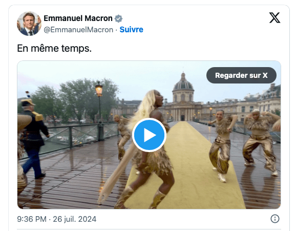 Dans le détail – et parmi ce spectacle de plus de trois heures – certaines scènes ont particulièrement retenu l’attention des personnalités politiques. «Name a better duo, I’ll wait», a par exemple publié sur X le premier ministre Gabriel Attal, en commentant les vidéos de la chanteuse Aya Nakamura accompagnée par la garde républicaine. «Masterclass. Quelle cérémonie», a abondé Bruno Le Maire en commentant les mêmes images. «En même temps», s’est contenté d’écrire le président de la République en faisant référence à sa célèbre formule censée représenter son positionnement politique. Ce bon mot – visionné par plus de 8 millions d’internautes – n’a pas manqué de faire réagir les internautes.