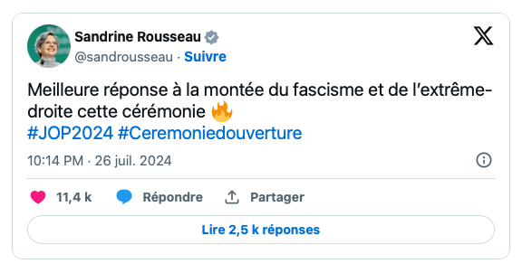 À cette joute verbale, se sont ajoutés de véritables commentaires politiques. Notamment dans la bouche de la députée écologiste Sandrine Rousseau. «Meilleure réponse à la montée du fascisme et de l’extrême-droite cette cérémonie», a-t-elle d’abord publié sur X en visionnant le spectacle. Avant d’ajouter : «Que le monde soit woke. Il sera tellement plus beau». L’écologiste est finalement allée plus loin en faisant référence à la candidate désignée par le Nouveau Front populaire pour s’installer à Matignon : «Reste plus qu’à nommer Lucie Castets et on est bon», s’est-elle amusée. Le député insoumis Thomas Portes, récemment pris dans une polémique car il a affirmé que «la délégation israélienne n’était pas la bienvenue à Paris», a déclaré : «Une cérémonie des JO à rebours des obsessions racistes et réactionnaires de l’extrême-droite et de ses relais médiatiques». Avant de préciser : «Une cérémonie où la délégation Palestinienne a été applaudie».