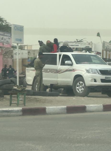 Dans un quartier de Nouakchott, des migrants dans un véhicule des forces mauritaniennes, correspondant aux 4 × 4 fournis en 2019 par l’Espagne aux policiers mauritaniens, selon un document que « Le Monde » s’est procuré, le 23 janvier 2024. EQUIPE LIGHTHOUSE REPORTS