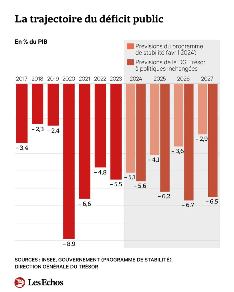 Selon le ministère des finances, le dérapage des comptes publics rend peu réalistes les engagements pris par la France. Mais même le respect minimal des règles européennes nécessite de trouver 30 milliards en 2025, et 100 milliards en 2028, écrit le Trésor dans une note consultée par « Le Monde ».