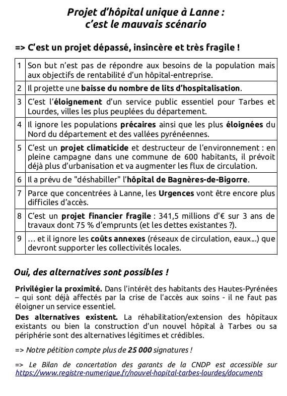 Dans le cadre de l’hôpital de Lanne, l’opposition estime que la population n’est pas écoutée. Une pétition contre l’hôpital unique de Lanne a recueilli environ 18 000 signatures. Une preuve pour les partis que les citoyens sont opposés au projet. Ils demandent un débat public car ce changement concerne avant tous les patients. Un hôpital à Lanne ajouterait du temps de trajet pour les habitants de l’est du département et des vallées des Pyrénées. Les opposants veulent défendre les personnes âgées de Tarbes et de Lourdes pour qui il serait encore plus compliqué d’accéder aux soins. Ils ajoutent aussi que la durée de transport des urgences vitales pourrait être rallongée, ce qui présenterait un risque sanitaire.
