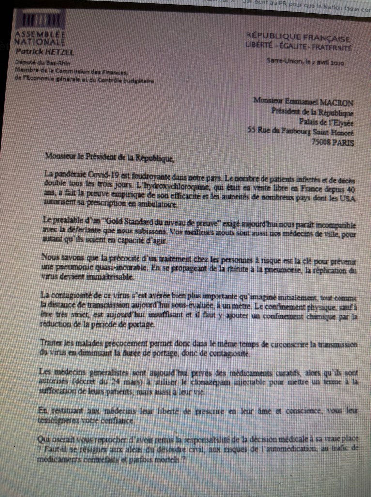 J’ai écrit au PR pour que la Nation fasse confiance à ses médecins et autorise temporairement l’utilisation de l’hydroxychloroquine, de l’azithromycine et du Zinc dans le traitement précoce du COVID et ceci jusqu’à ce que soient connus les résultats des essais cliniques en cours (https://x.com/patrickhetzel/status/1245743160682254336?ref_src=twsrc%5Etfw%7Ctwcamp%5Etweetembed%7Ctwterm%5E1245743160682254336%7Ctwgr%5Ec3588df7c4cbaef05b0de9ff5e1727f85548a9ab%7Ctwcon%5Es1_&ref_url=https%3A%2F%2Fwww.egora.fr%2Factus-pro%2Fpolitiques%2Fle-nouveau-ministre-de-la-recherche-defendait-lhydroxychloroquine-pendant-la)