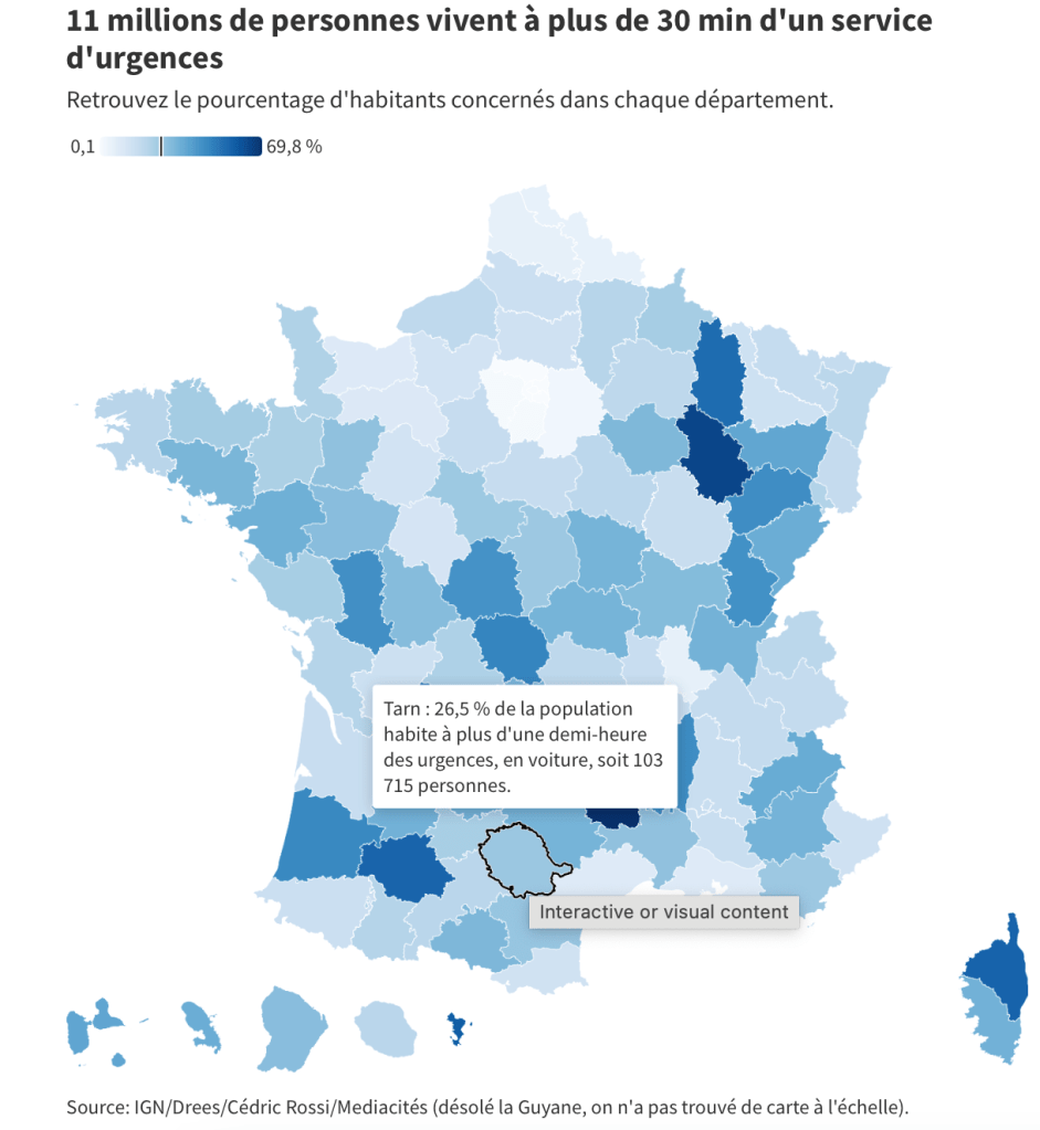 Dans les départements limitrophes, la carte de Cédric Rossi révèle des chiffres bien plus importants. 16,2 % des habitant·es de la Loire, soit 121 275 personnes, vivent à plus de trente minutes d’un service d’urgences. Ils sont 17,4 % en Isère (222 583 personnes) et 33,6 % dans l’Ain (218 647 personnes).
