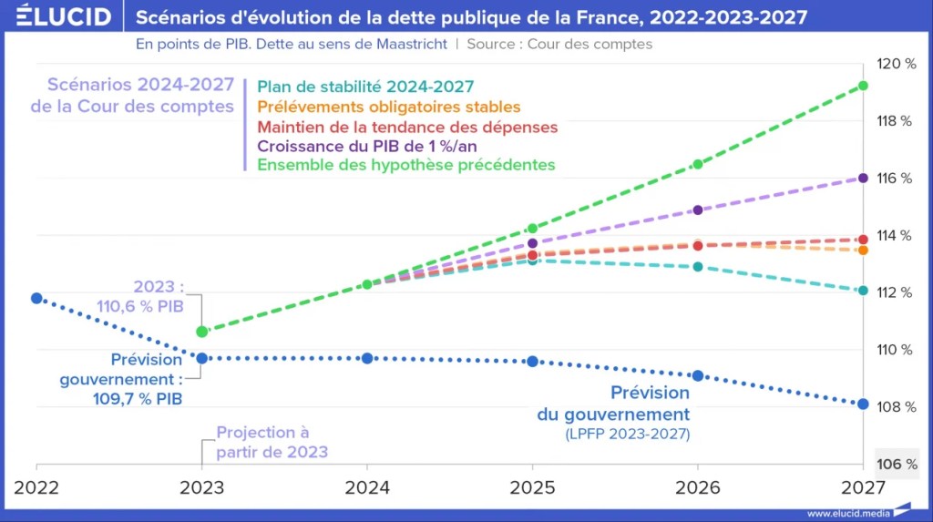 La Cour des comptes n’est pas plus tendre avec l’objectif prévisionnel de dette du gouvernement pour 2027, qui s’élève à 112 %. Le rapport montre la fragilité ou l’optimisme de cette trajectoire en projetant plusieurs autres scénarios alternatifs.